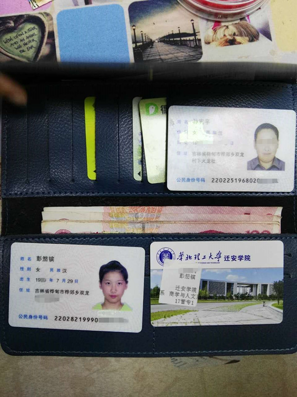 据李先生讲述,他是贝因美奶粉的工作人员,名叫李东明,9月5日下午16:35左右,他去奥体中心久红孕婴店的贝因美专厅送货,在贝因美专厅附近的地上捡到一个蓝色钱包。怕失主着急,李先生特意在原地等了一会儿,见无人寻找,就打开了钱包寻找失主的信息。李先生称,他在查看钱包时发现,钱包里有两张身份证、几张银行卡、还有近千元的现金,其中还有一张河北理工大学迁安学院的卡,卡上贴着彭笳镔的名字和迁安学院的信息,由此推断失主很可能是理工大学的学生。